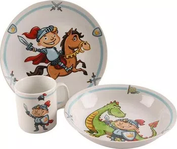 Informace o výrobkuOrionPopisDětská porcelánová jídelní sada Rytíř pro vaše nejmenší. Sada obsahuje hrneček, hluboký a mělký talíř. To vše je zabaleno v dárkovém balení. Vhodné do myčky nádobí.